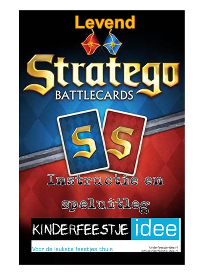 Zeer geschikt voor grote groepen (te spelen tot 50 kinderen!) Je kunt gedrukte Levend Stratetego kaartjes kopen (72 stuks) met 2 grote Levend Stratego vlaggen. Instructie kun je downloaden. Zeer betaalbaar en meermalen te gebruiken.