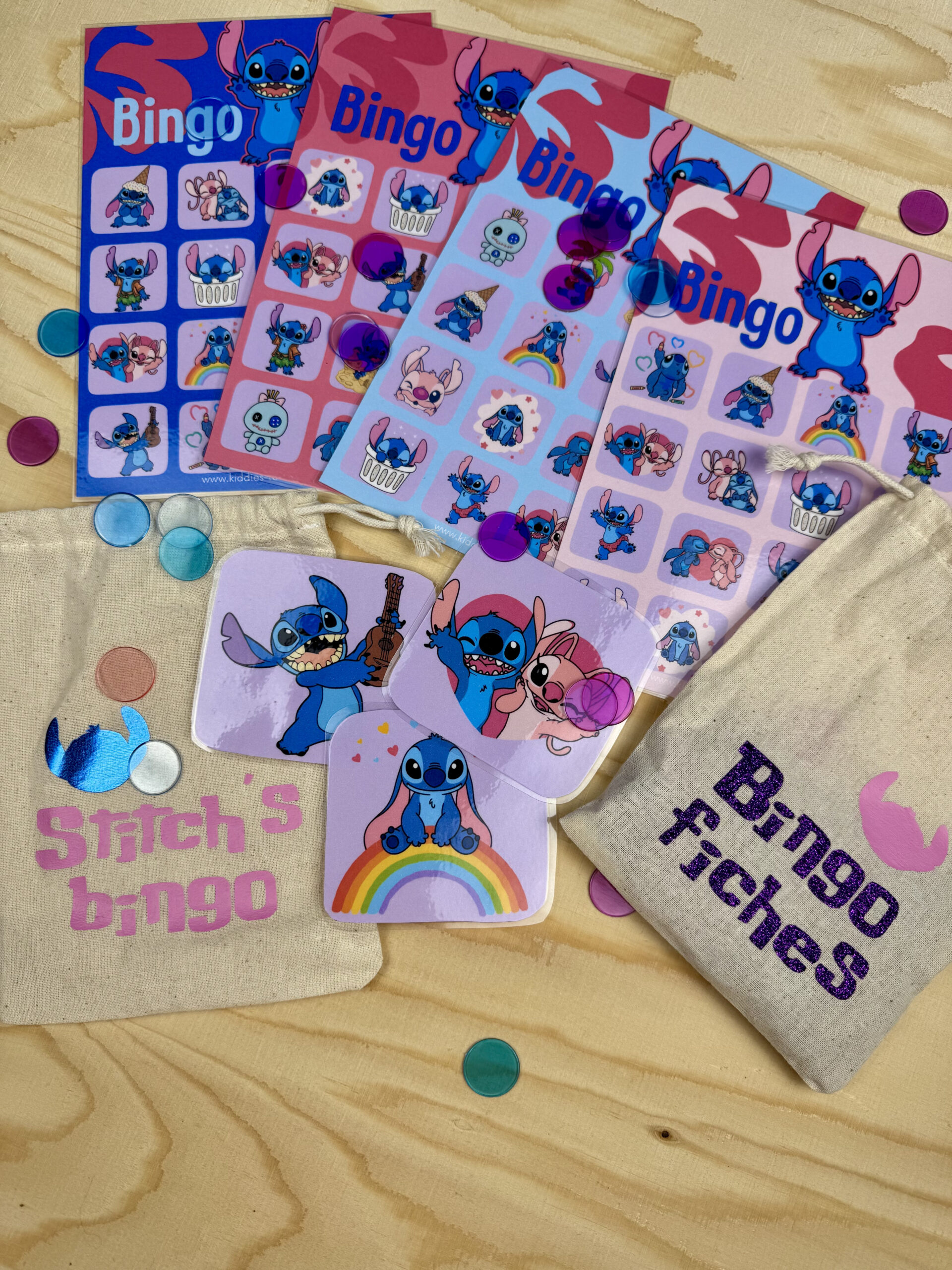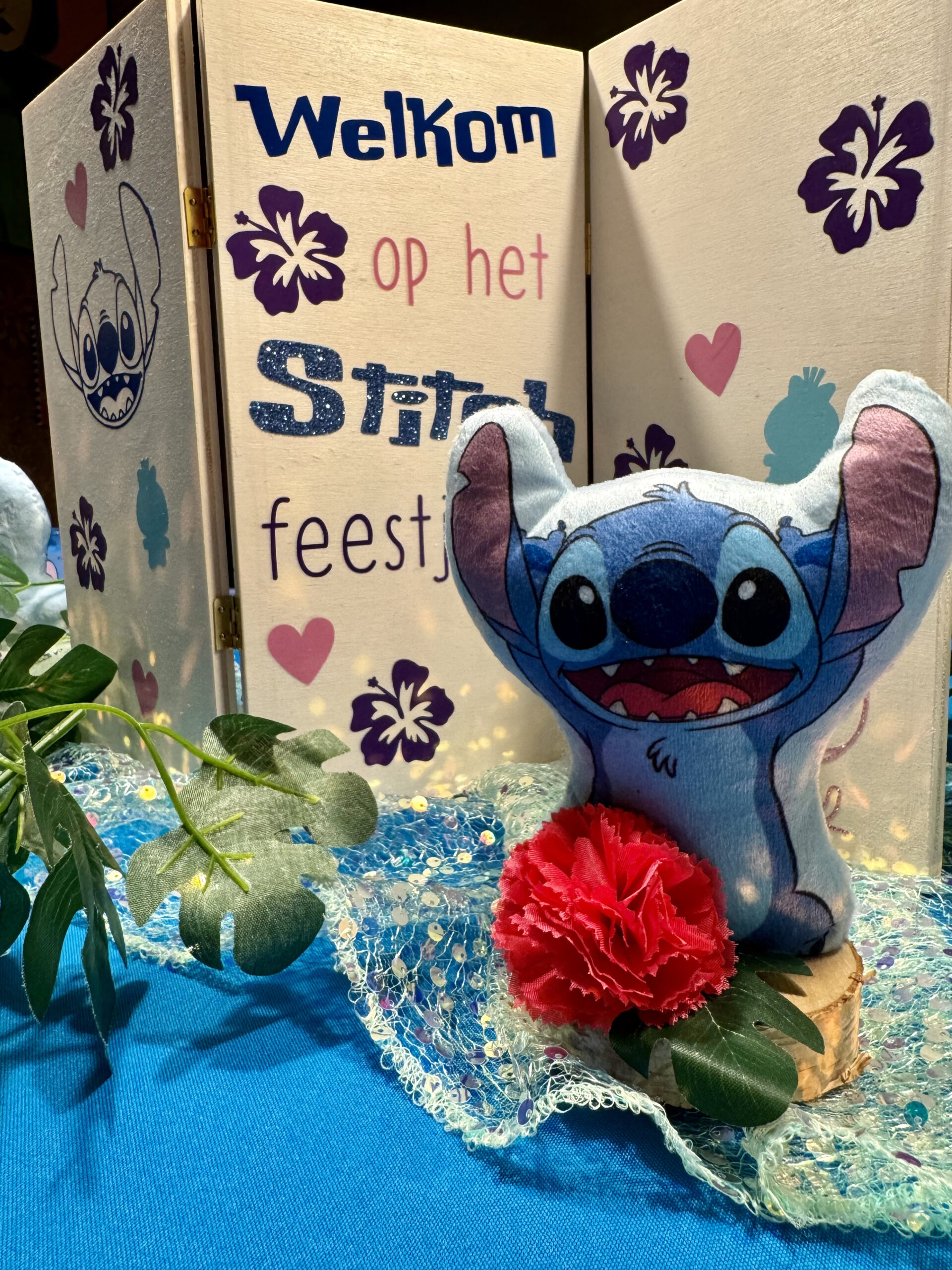 - versieringen in stitch thema: slingers (2x), tafelaankleiding, bordjes, bekers