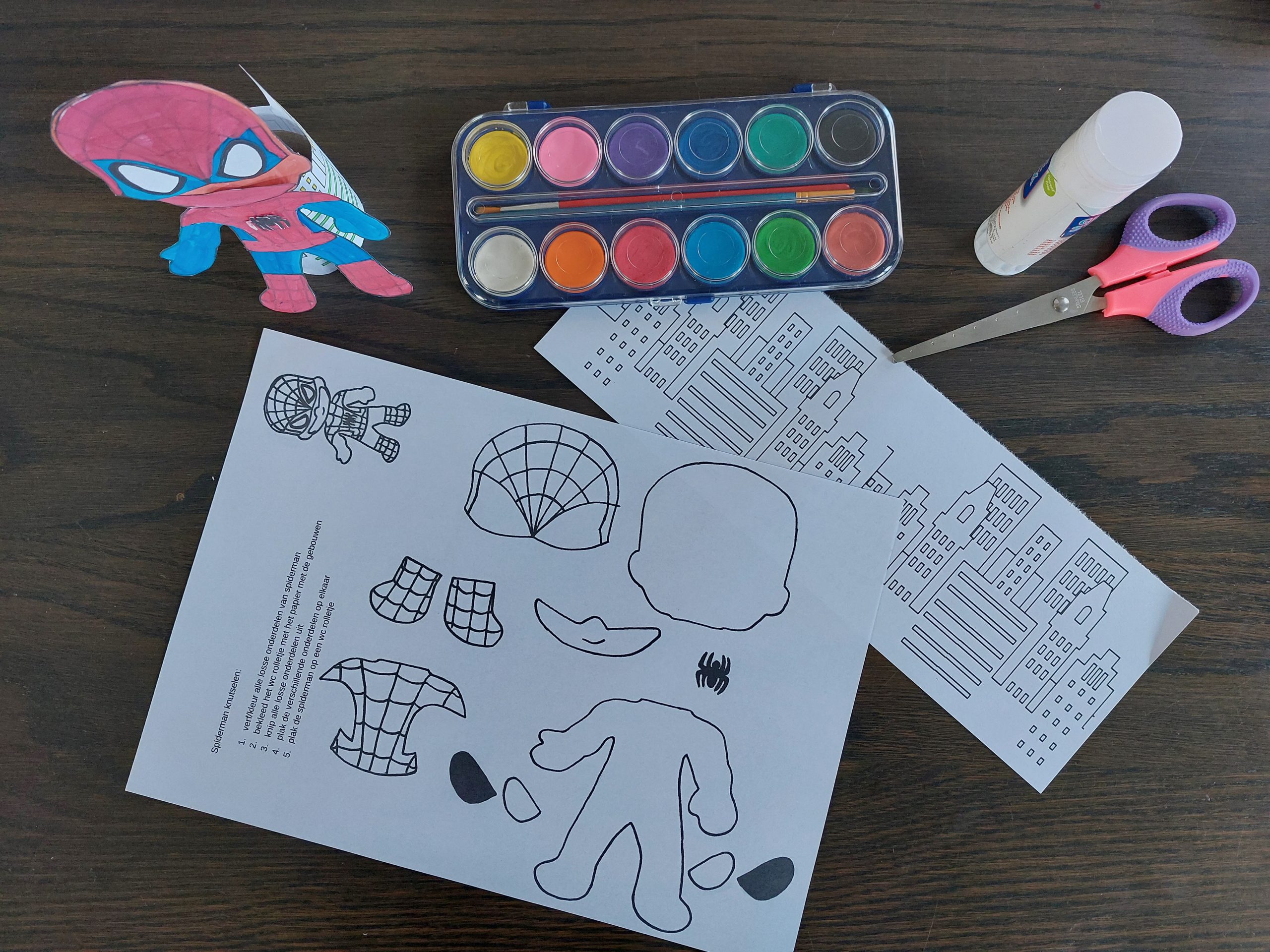 Houd je kind van knutselen, dan kun je het knutselpakket bijbestellen ( 1,- per kind). Ze gaan een spiderman knutselen. Spiderman is een beetje uit elkaar gevallen en de kinderen gaan hem weer in elkaar zetten. Kleur alle losse onderdelen en knip ze uit. Daarna plak je alles op een wc-rolletje en je spiderman is klaar. Alles wat je nodig hebt voor het maken van Spiderman is inbegrepen als je voor het knutselpakket kiest.
