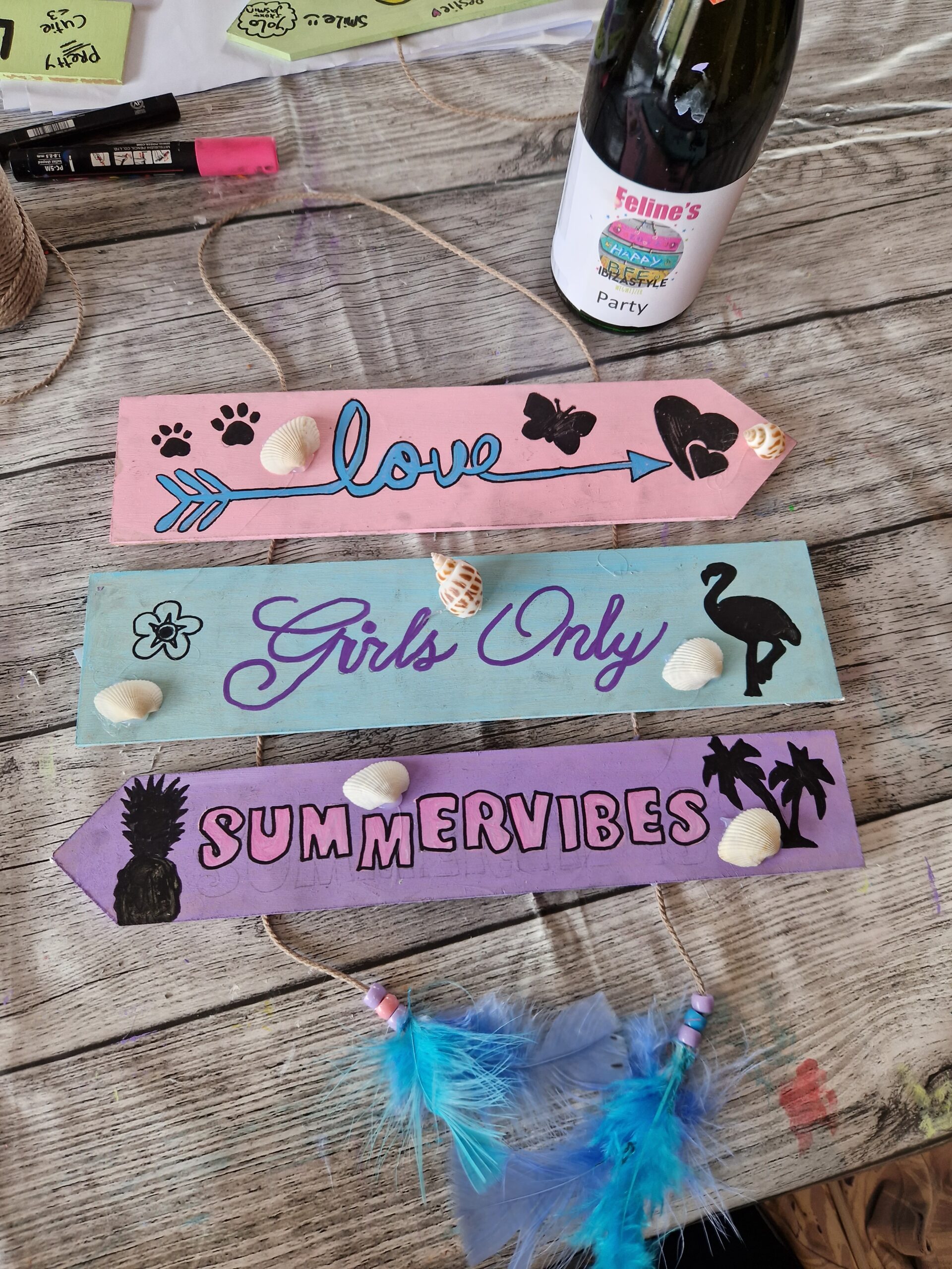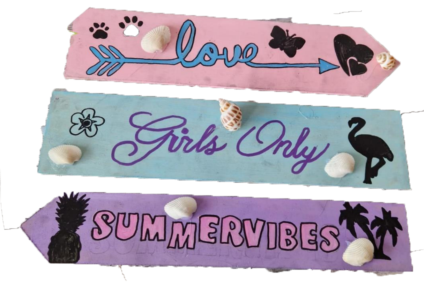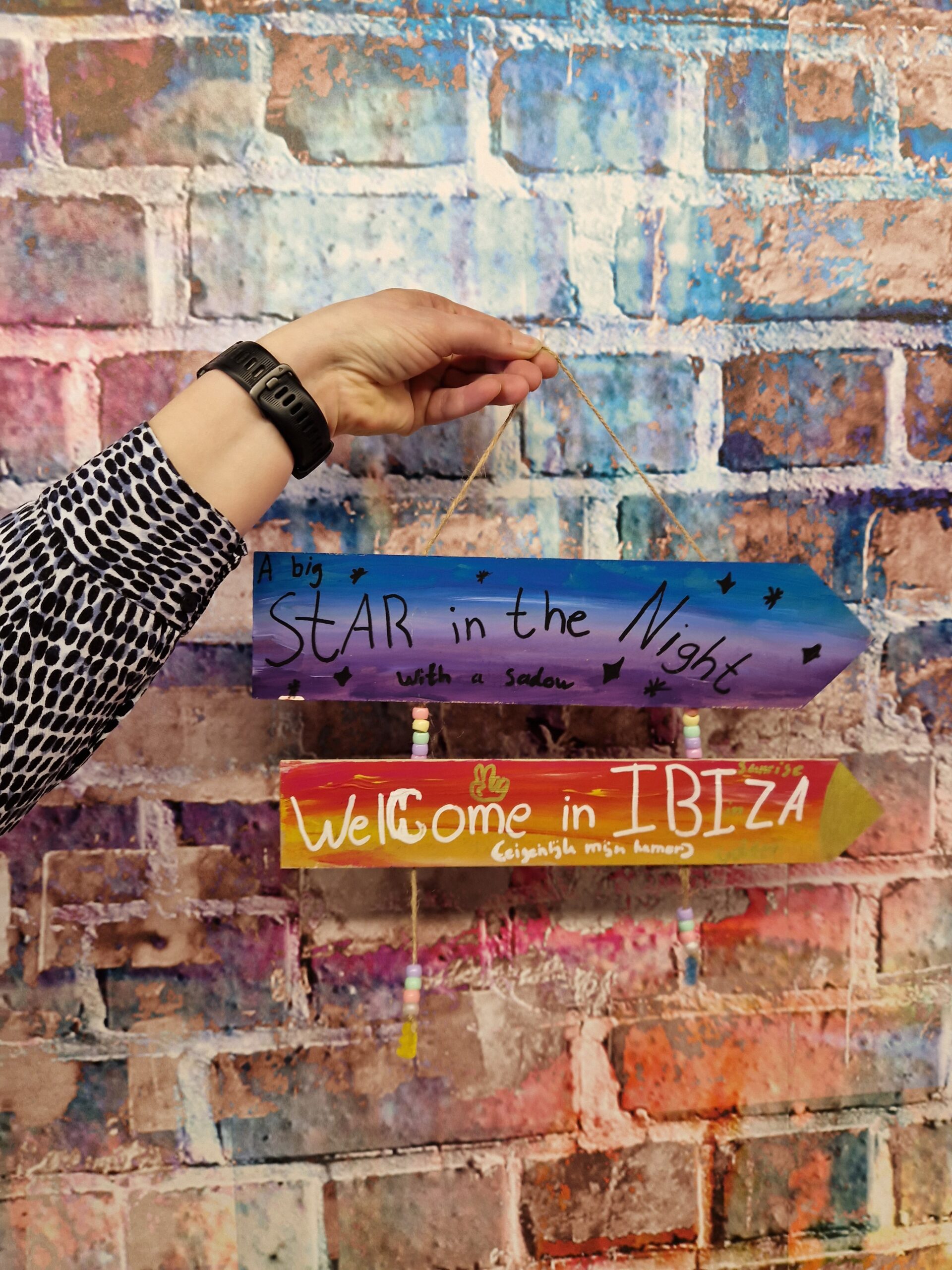 Je krijgt 3 plankjes hier kun je ibizastyle wegwijzer van maken. We gaan de plankjes eerst schilderen en als de verf zo goed als droog is gaan we er teksten op maken. De teksten en tekeningen bepaal jij uiteraard helemaal zelf. De teksten en tekeningen maak je erop met behulp van carbon papier of je tekent te teksten en tekeningen zelf. Wij sturen je verschillende lettertypen en plaatjes die je hiervoor kunt gebruiken. Als de letters en tekeningen op de plankjes ga je ze inkleuren met acryl verf en voor de afwerking ga je aan de slag met 3D verf dit geeft een super gaaf effect op jouw Ibizastyle wegwijzer.