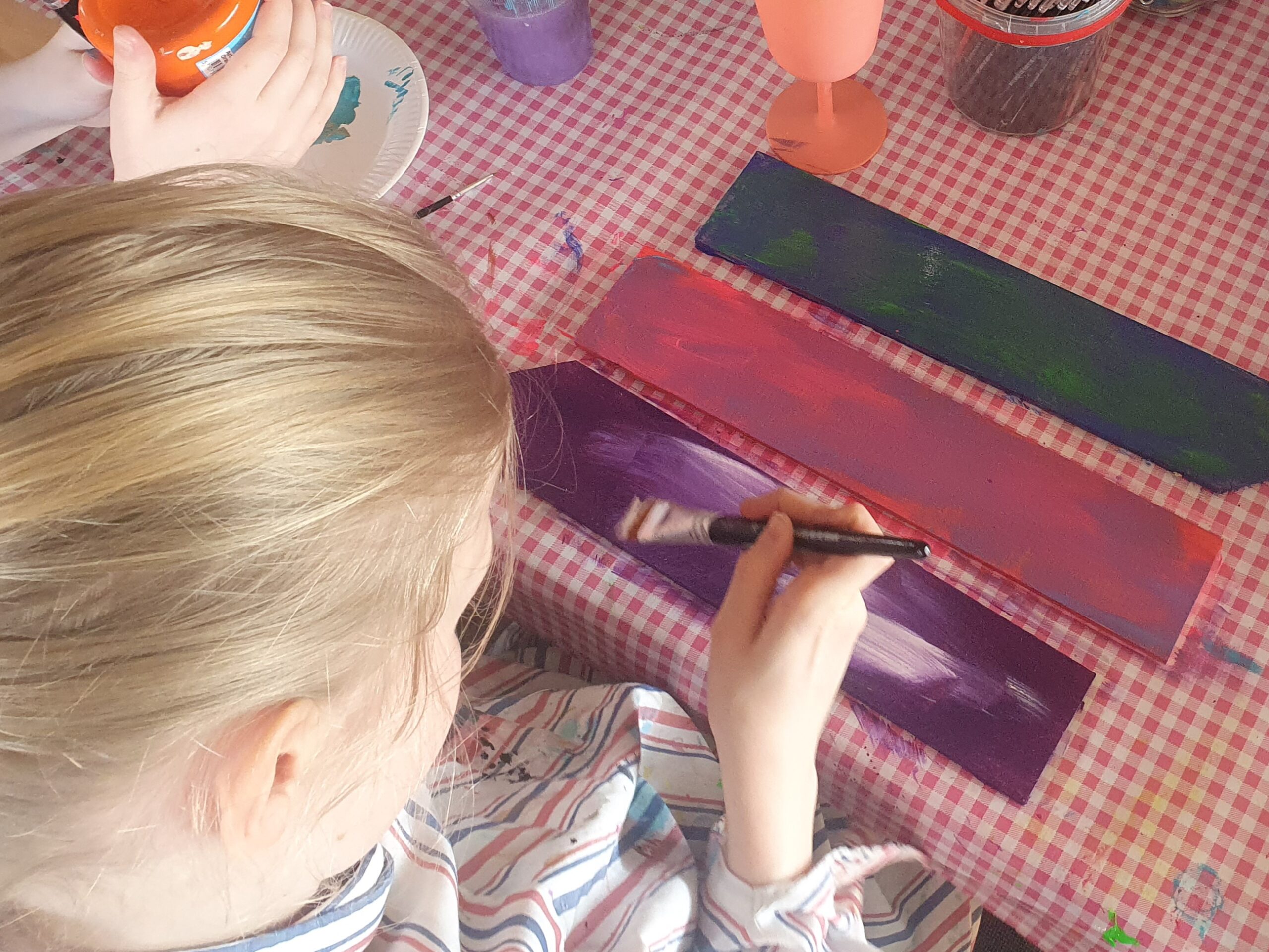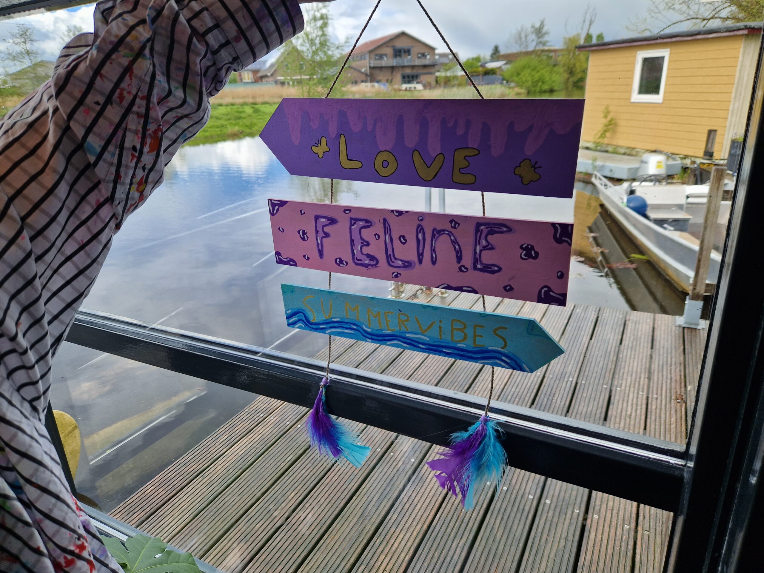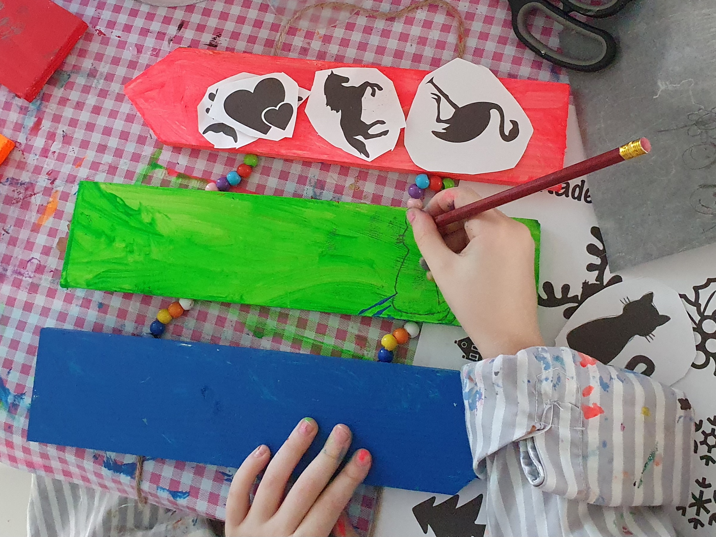 Als alle plankjes af zijn gaan we ze aan elkaar bevestigen met touw en misschien wil je er nog kraaltjes bij zodat jij ze thuis mooi kan ophangen.