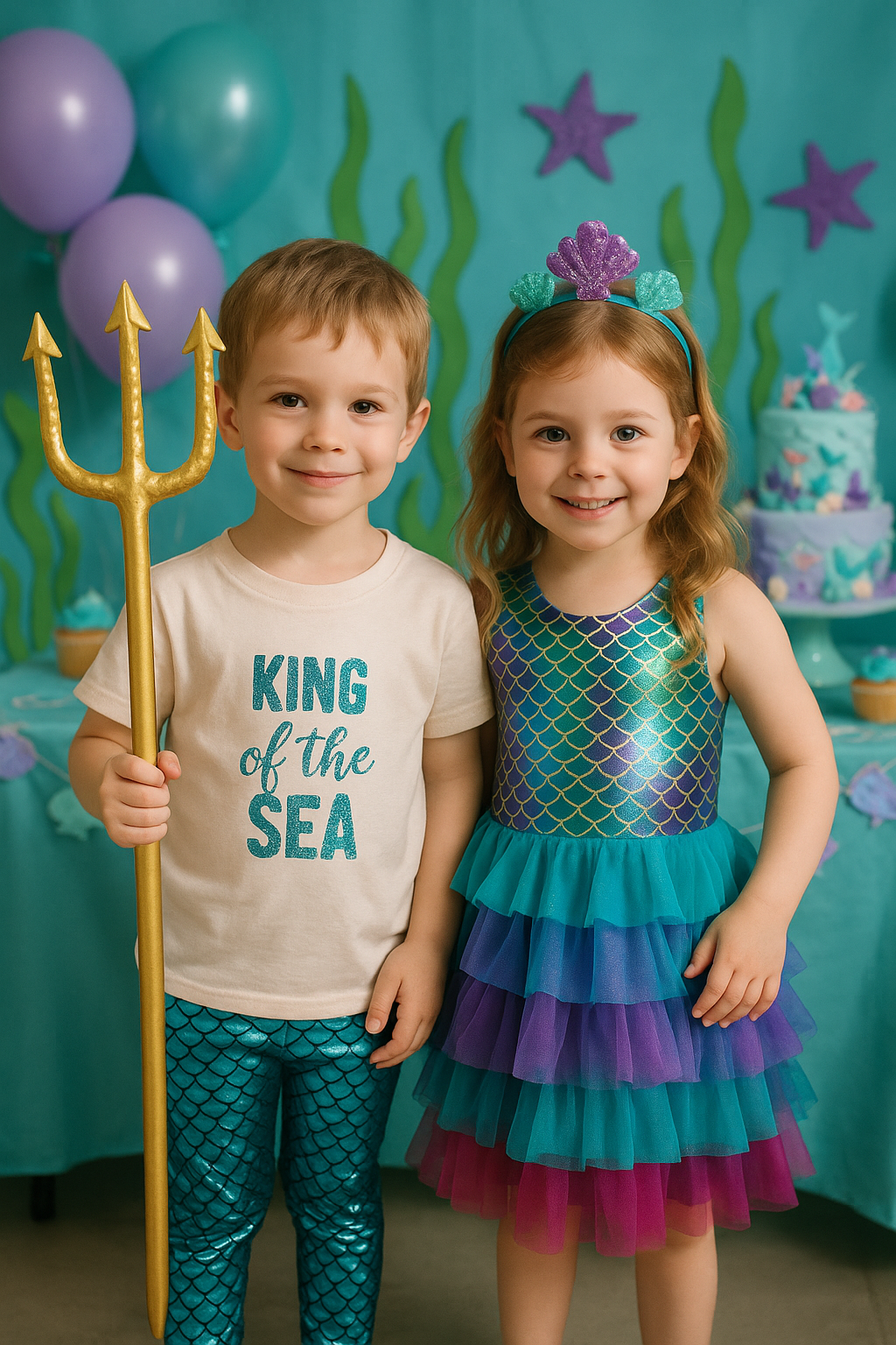 - verkleedkleren zeemeermin voor elk kind: jurkje met een staart, shirt en een rokje. En voor de jongens ”king of the sea” outfit